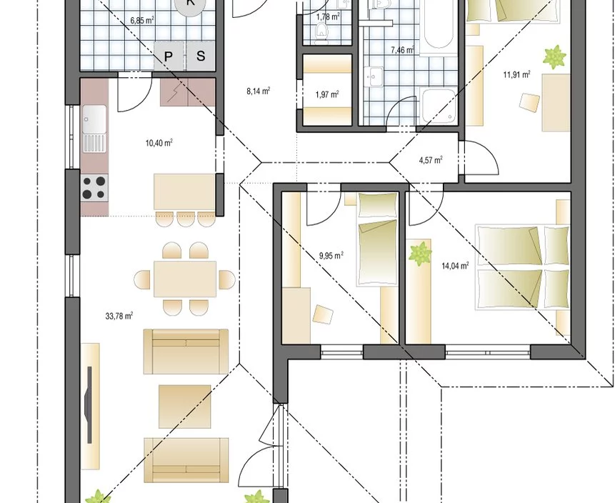 Přirozeným centrem domu je obývací pokoj s jídelnou a rozměrným kuchyňským koutem. Dále jsou v soukromém křídle bungalovu další tři samostatné pokoje, v Lucky se tak krásně zabydlí i početnější rodina. Největší pokoj může sloužit jako ložnice pro rodiče, dvě menší místnosti jako dětské pokoje, místnost pro hosty, pracovna či třeba ateliér.